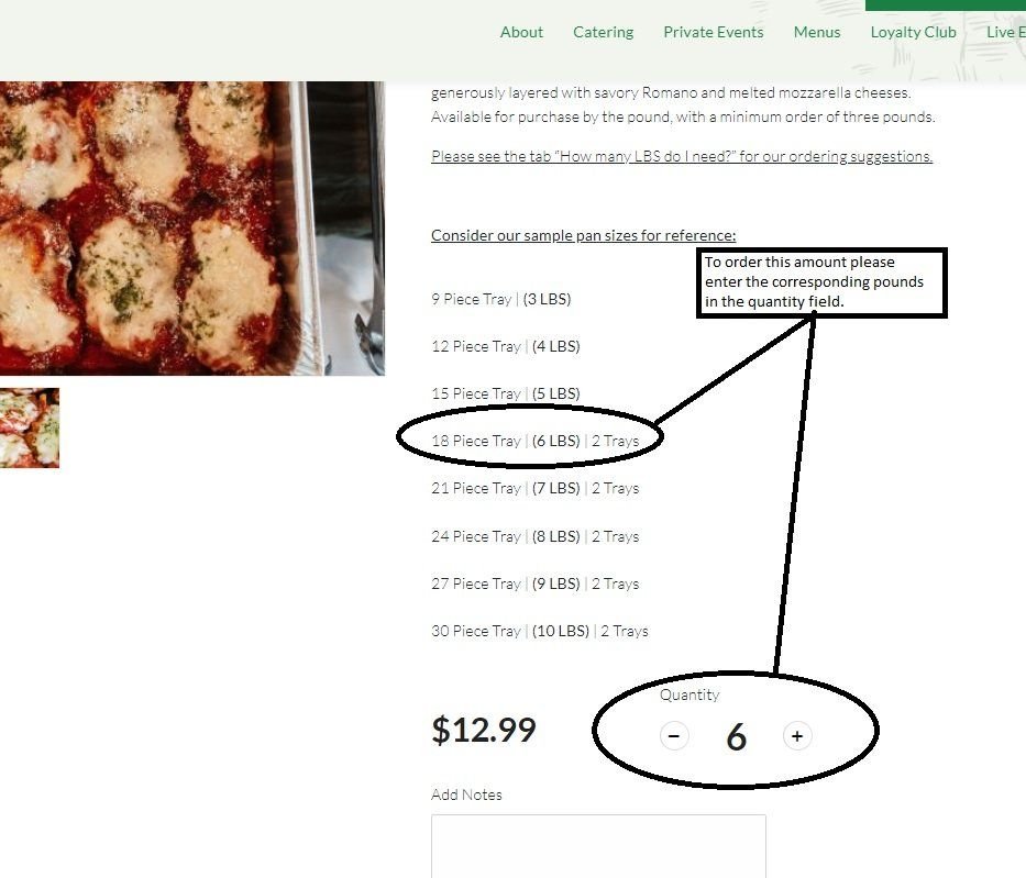 In the image below, you'll see an example of how to select the quantity of pounds needed. For instance, if you require an 18-piece tray (6 pounds), you would enter "6" in the quantity field to order the corresponding amount. Use this information as a guide to ensure you order the right amount of food for your event.