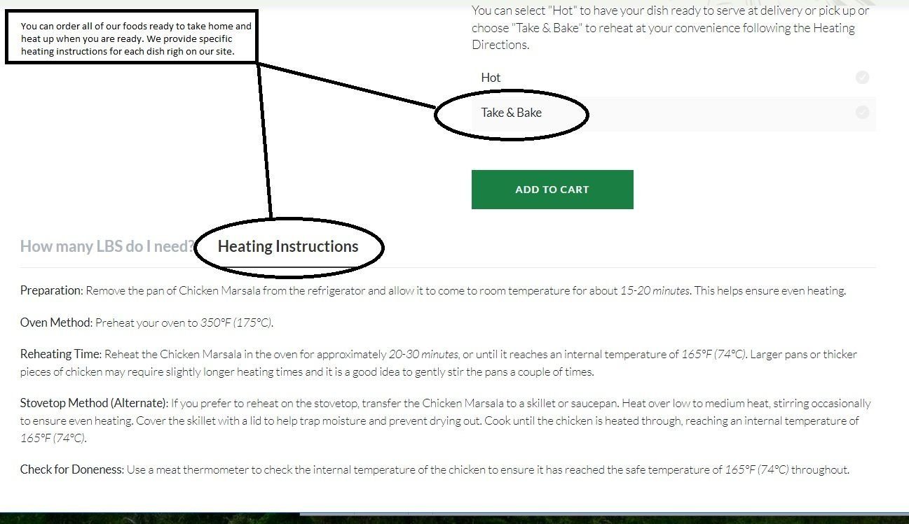 In the image below, you'll see an example of how you can select "Take & Bake" and find the heating instructions for your dish. This ensures that your food is heated to perfection, ready to serve at your convenience.